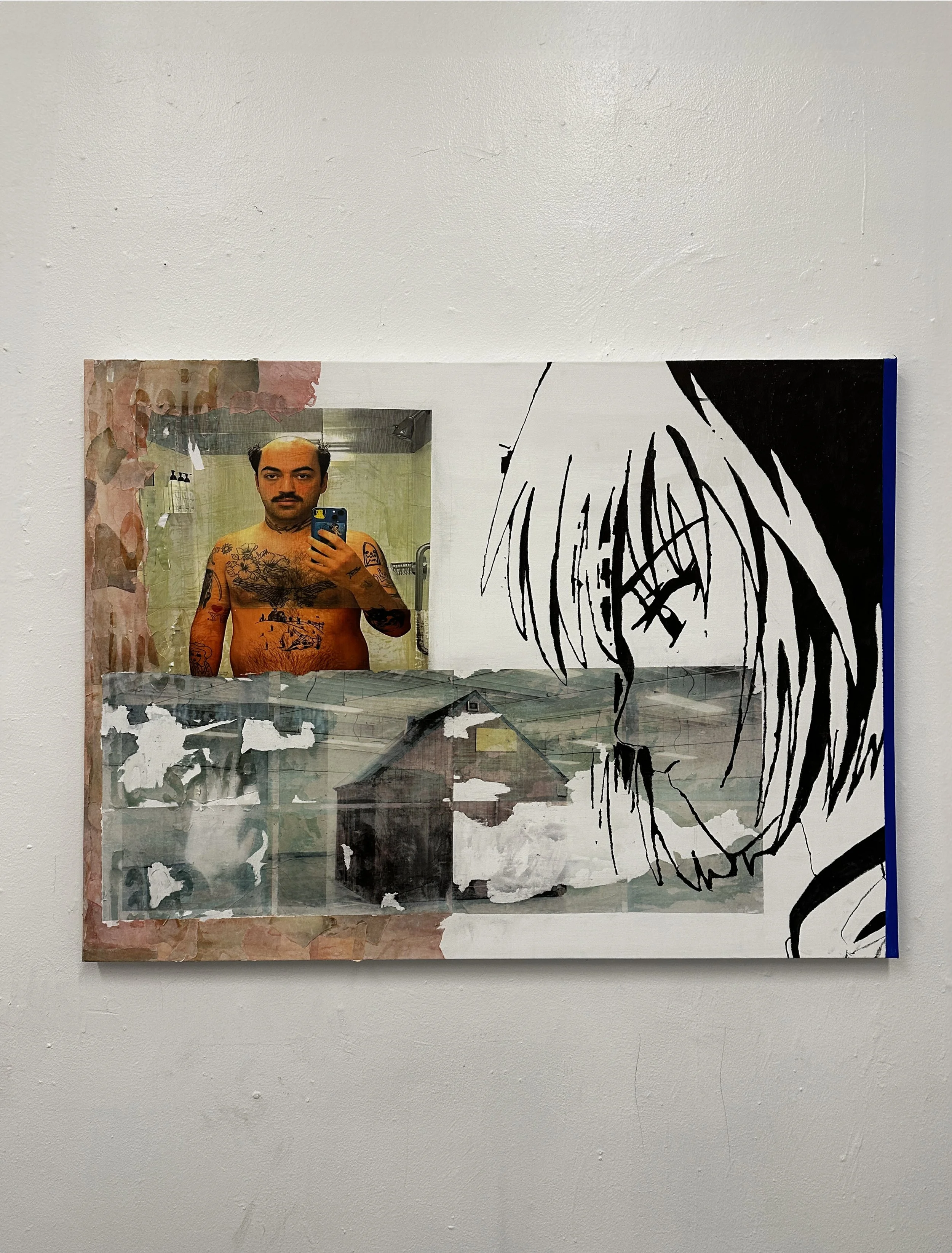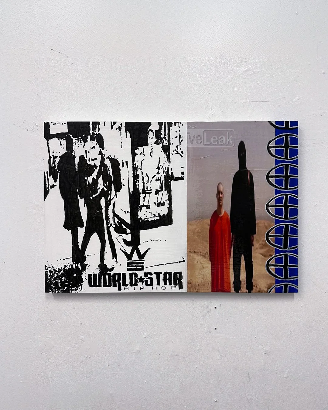 I collect visual fragments from online archives, pop culture debris, screenshots, and digital ephemera—bits of media that feel both disposable and sacred. Through digital collage and physical translation onto canvas, I reassemble these pieces into disjointed tableaux that mirror the emotional dissonance of existing in a hyper-mediated world. The results are both playful and haunted, oscillating between irony and sincerity.
